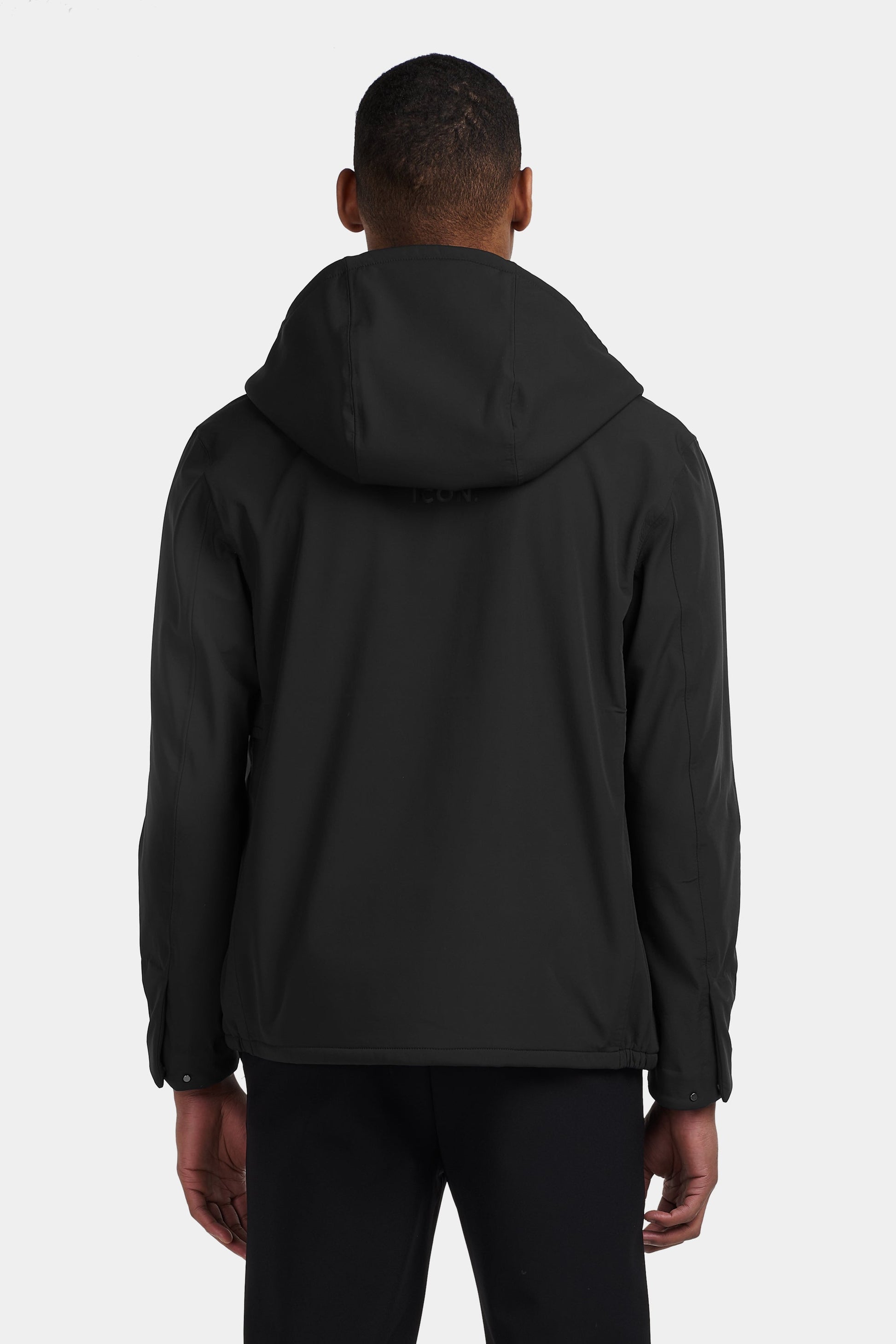 A technical soft shell jacket crafted from a lightweight bonded polyamide stretch blend. Designed with a hooded high collar, waterproof front zip closure, and invisible zip pockets for sleek protection. Features include elasticated hem, vented armholes for breathability, snap button cuffs and internal taped seams, all finished with a water-repellent coating.