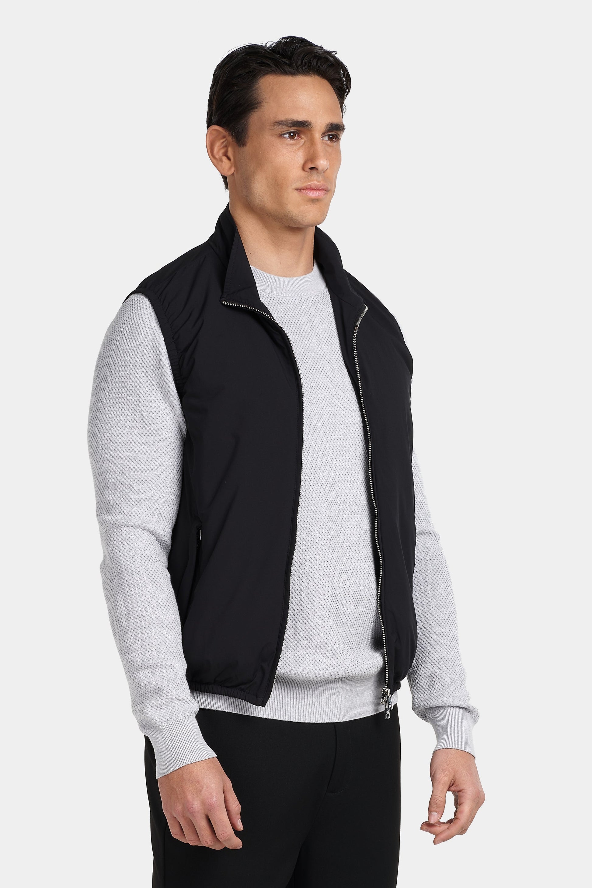 A lightweight and padded body warmer designed for transitional layering. Featuring a high collar, double-end zip closure and elasticated trims for a secure fit. Designed with water-repellent fabric and side entry welt pockets for added functionality.